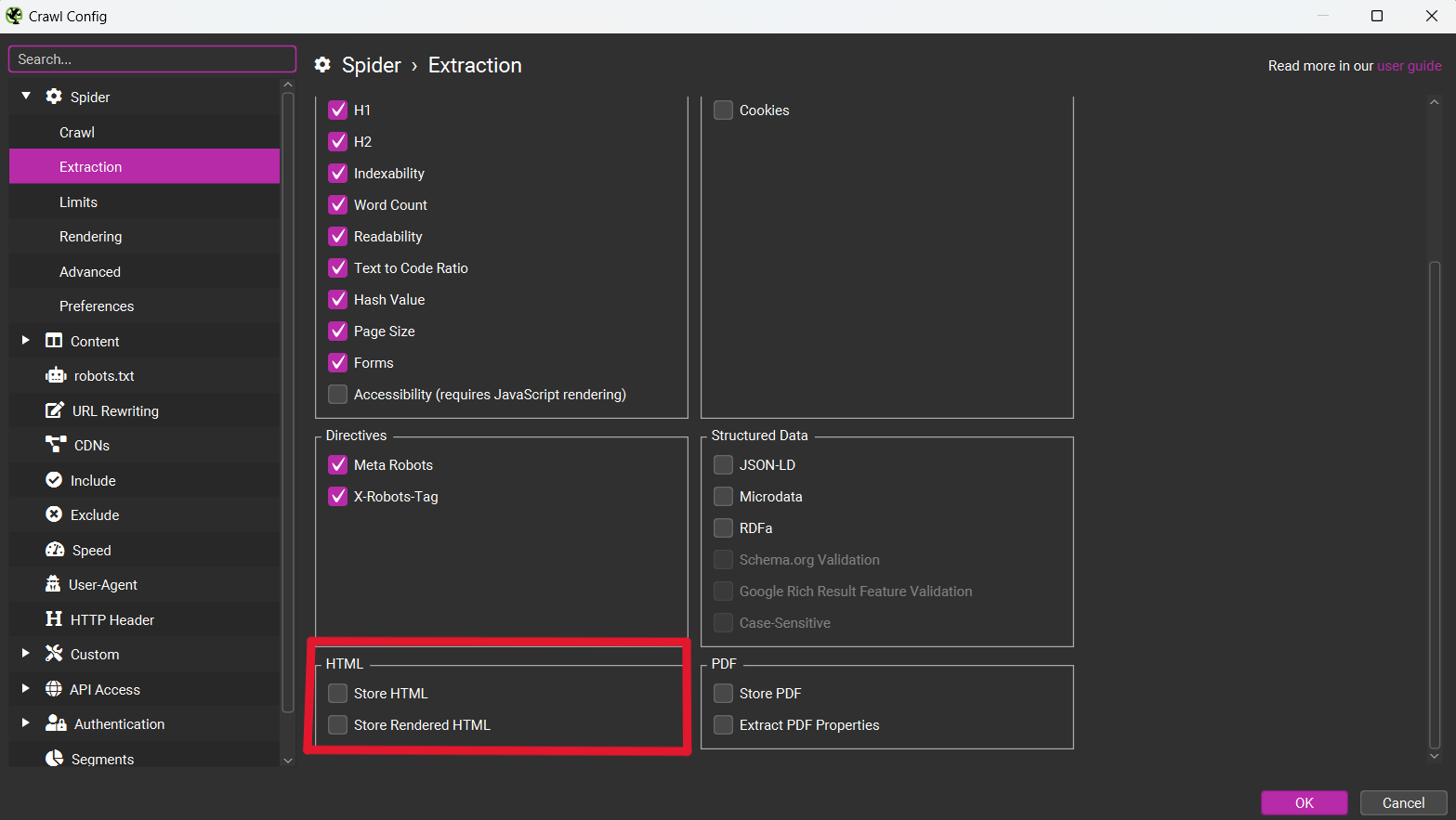 2) In the extraction menu enable ‘store html/ store rendered html’