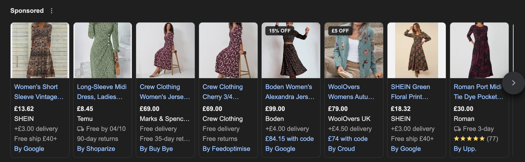 Alt text: A screenshot of Google Shopping ads showing womenâs floral and patterned dresses from brands including SHEIN, Temu, Marks & Spencer, Crew Clothing, Boden, WoolOvers, and Roman. Prices range from ÂŁ8.45 to ÂŁ99.00, with promotional tags such as â15% OFFâ and âÂŁ5 OFFâ visible on some items.