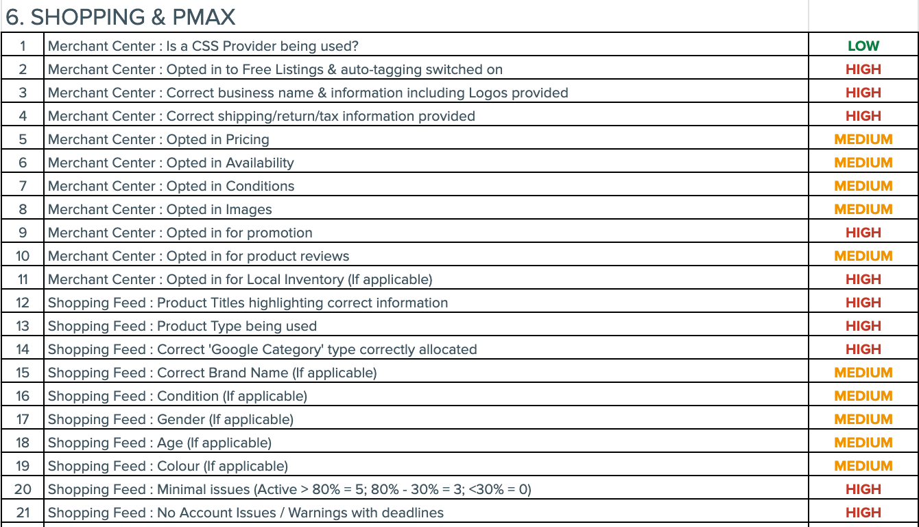 Alt text: A checklist table titled â6. SHOPPING & PMAXâ showing 21 Merchant Center and Shopping Feed criteria with priority ratings. Items include settings like âOpted into Free Listings,â âCorrect shipping/return/tax information,â âProduct Titles highlighting correct information,â and âCorrect Google Category type allocated.â Each row is assigned a priority level: LOW (green), MEDIUM (orange), or HIGH (red), with most entries marked HIGH.